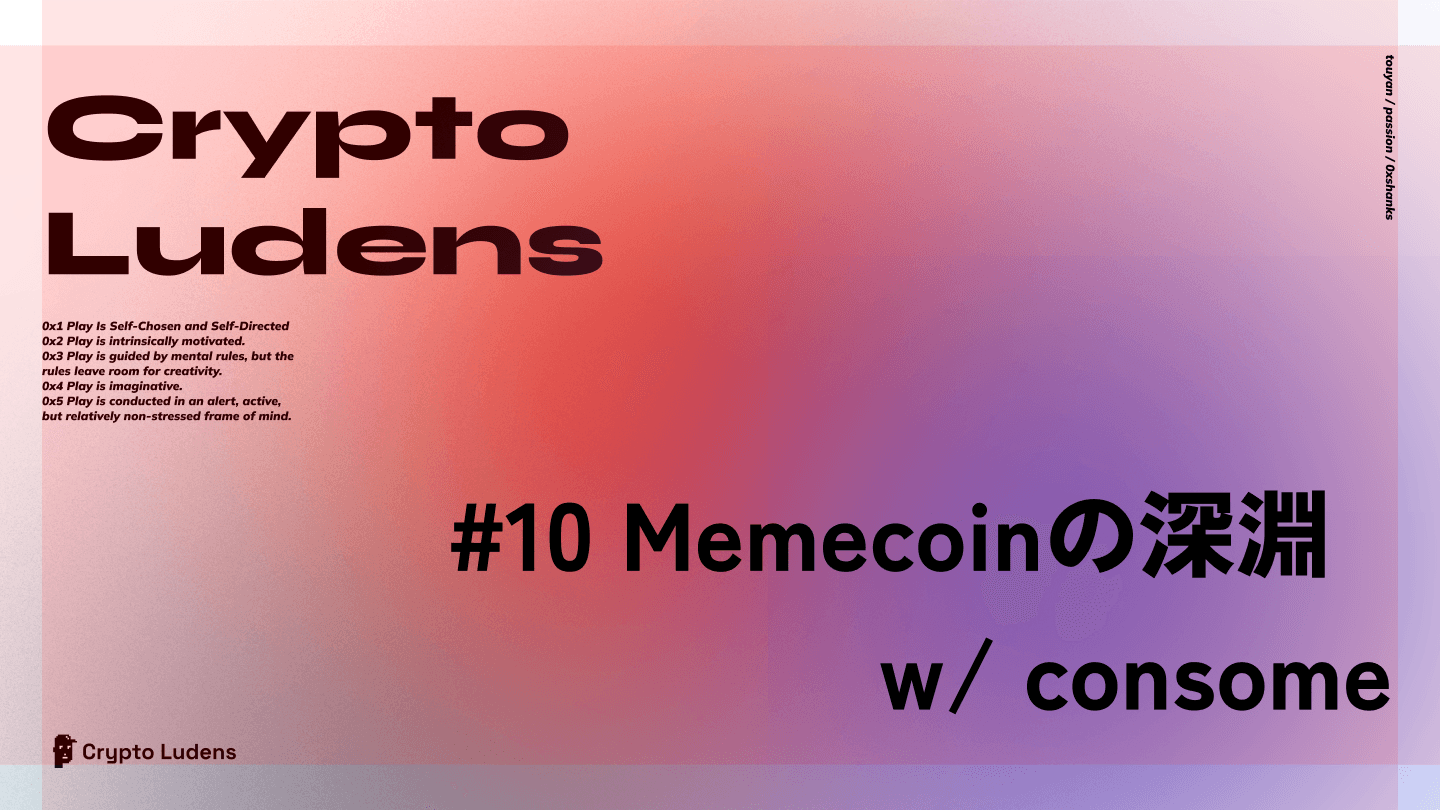 今回は、「Memecoinの深淵」をテーマに、consomeさん(@ZKEther)をゲストにお招きして、以下のトピックについて話しています!